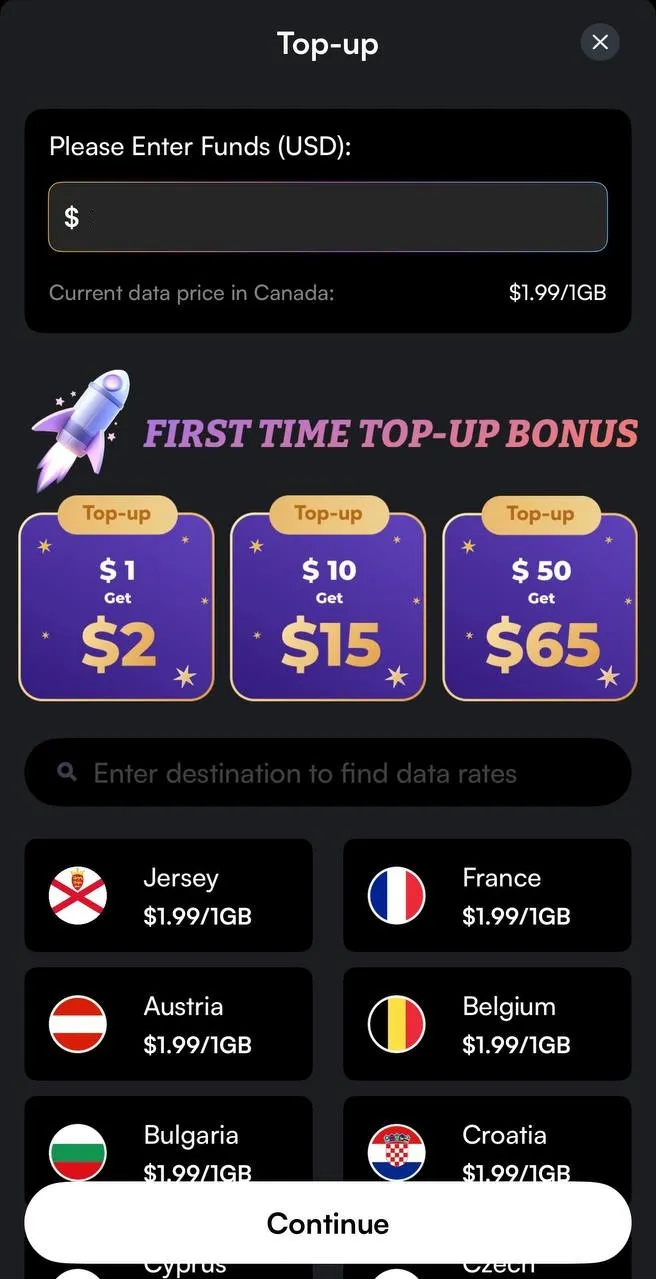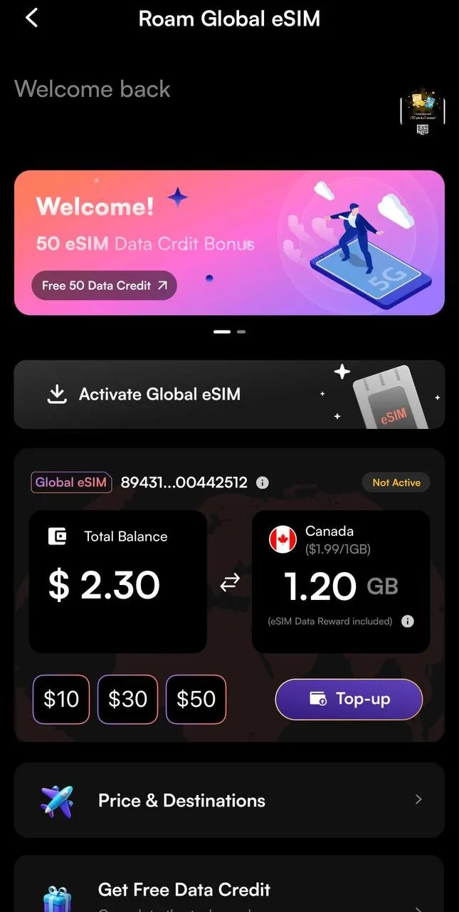 Top Up on the Go: Running out of data is a thing of the past. Roam allows you to top up your balance in advance, so you can easily purchase and use the data you need from anywhere with just a few taps.